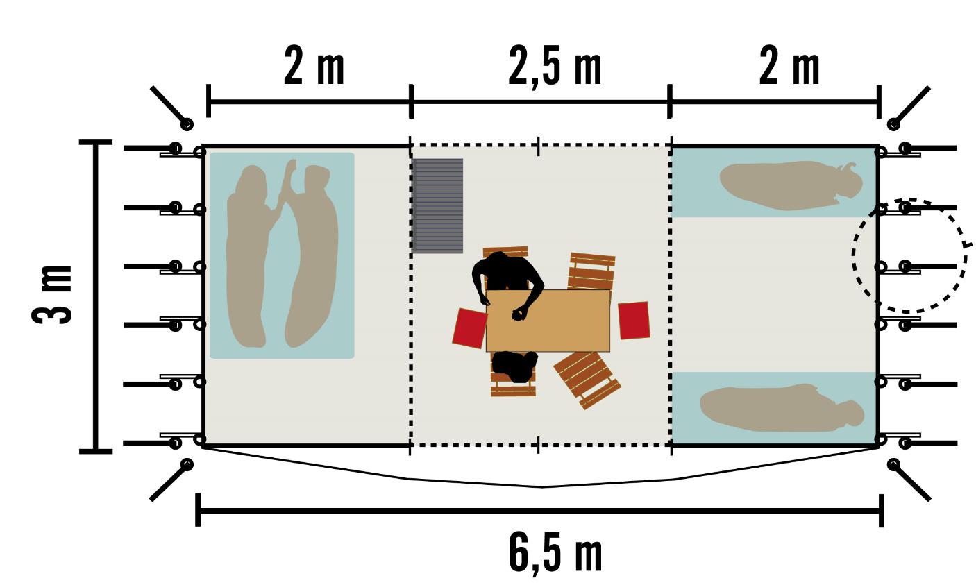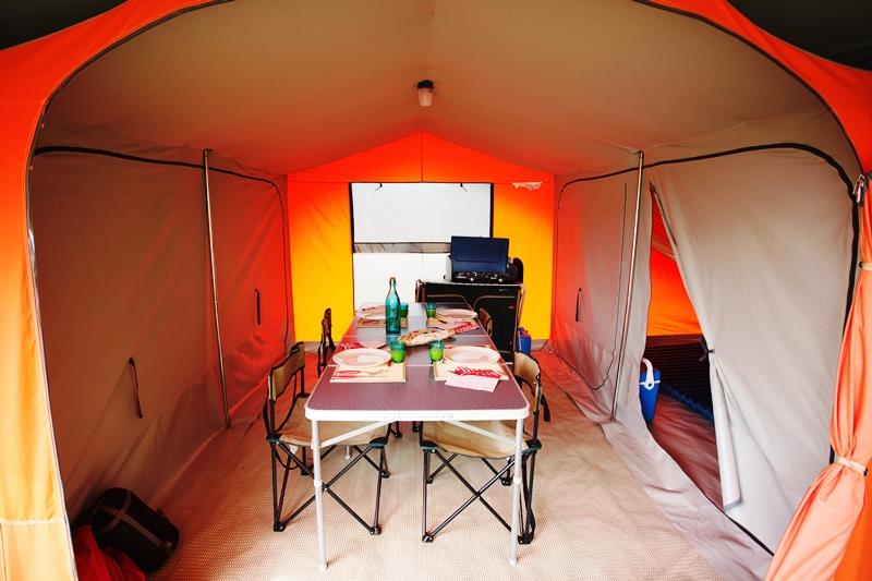 Une partie séjour : véritable salle à manger spacieuse de 7,50m2, dans laquelle on peut se tenir debout. Elle est équipée d’un réfrigérateur, d’une table et de 4 chaises pliantes et 2 fauteuils détente. Le coin cuisine dispose d’un meuble de rangement et d’un réchaud à gaz, et d’un kit vaisselle complet. Une partie couchage composée de 2 chambres : 2 chambres de 2m X 3m chacune, équipées pour l’une d’un matelas gonflable 2 places (140cm) et pour l’autre d’un matelas gonflable 2 places (140 cm)
