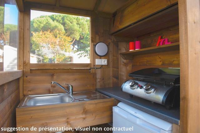 Un mode de vacances en camping vous attend au Conleau. Profitez des nombreuses installations innovantes : cabane avec douche et sanitaire privatif et abrité, coin cuisine équipé d’un évier, mini réfrigérateur, rangements, plaques de cuisson. Pour vos repas, vous apprécierez la salle à manger couverte d’extérieur.